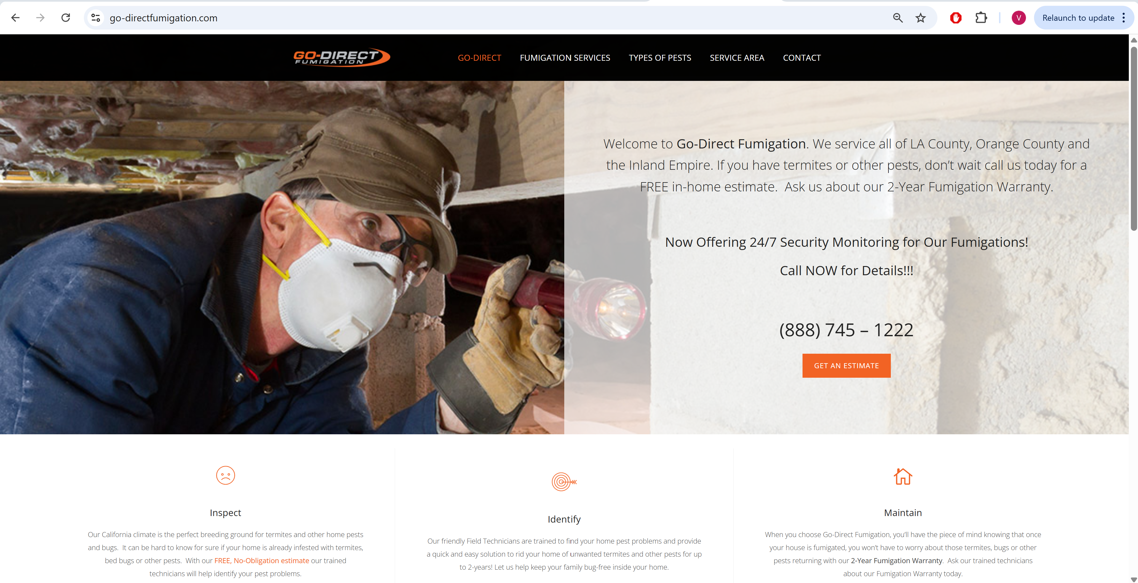 Rudy Go-Direct Fumigation 5 (1) added by Vinh Luu | Face It Marketing El Monte, CA Speak English Spanish(Español) Connect @ Profile Unlaimed Claim Profile 1 Followers Pest Control Termite Fumigation Fumigation Termite Go-Direct Fumigation is a family-owned termite control and fumigation company that was founded in 1982. We service all of LA County, Orange County and the Inland Empire. If you have termites or other pests, don’t wait call us today for a FREE in-home estimate. Ask us about our 2-Year Fumigation Warranty.Now Offering 24/7 Security Monitoring for Our Fumigations!Call: (888) 745-1222 User Location: - | lat: lon: Search Location: | lat: lon: